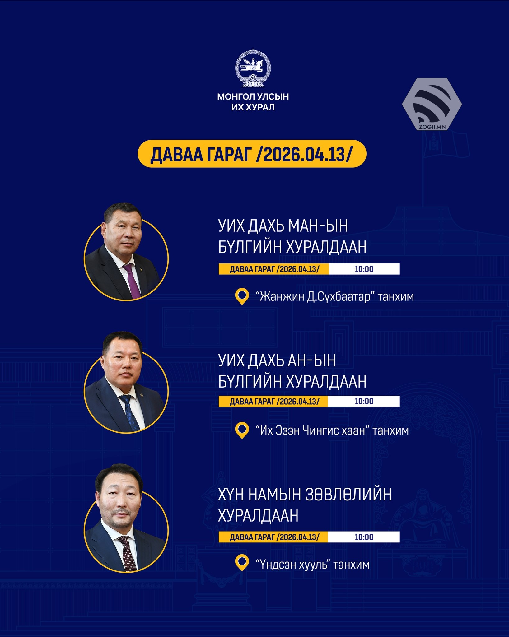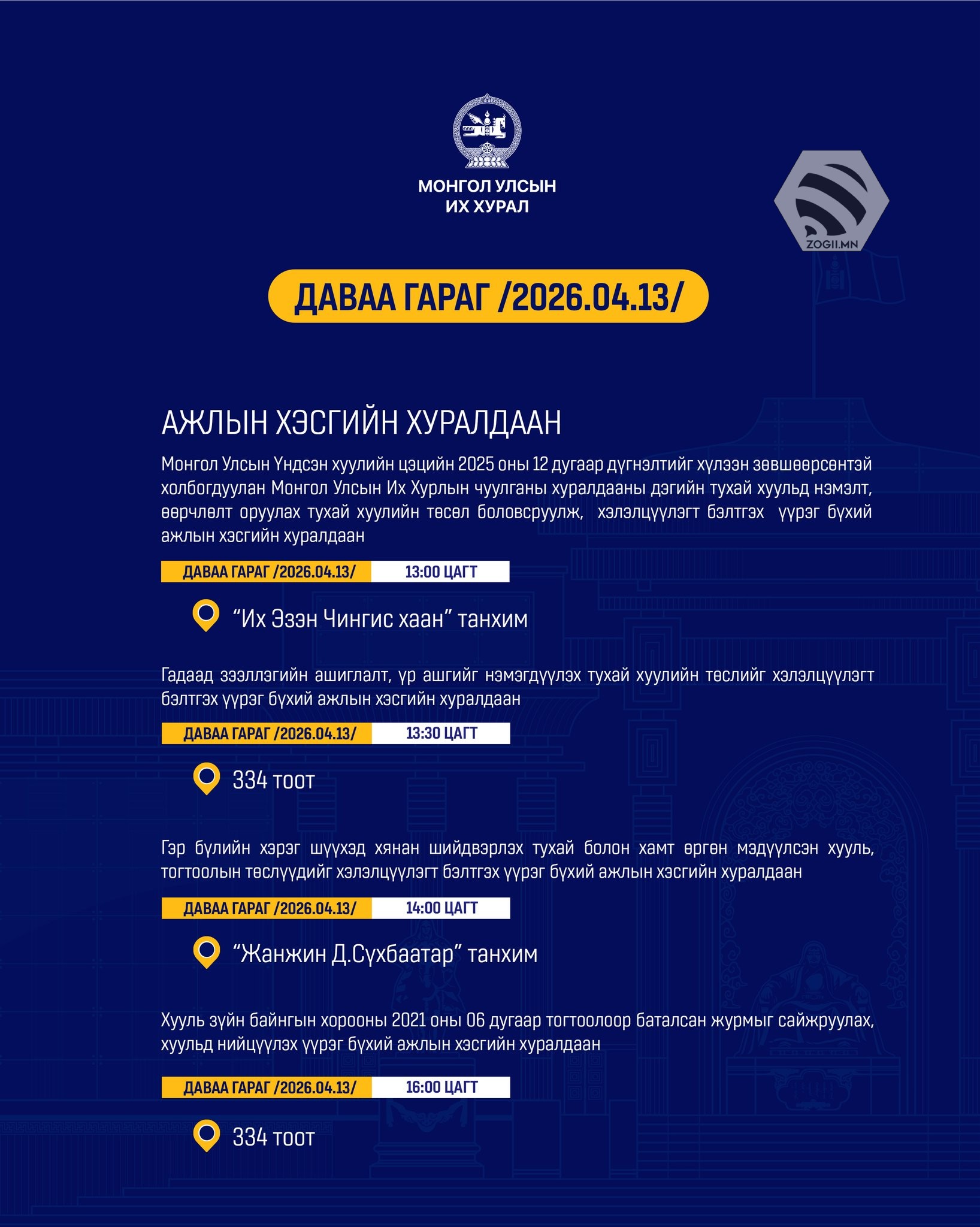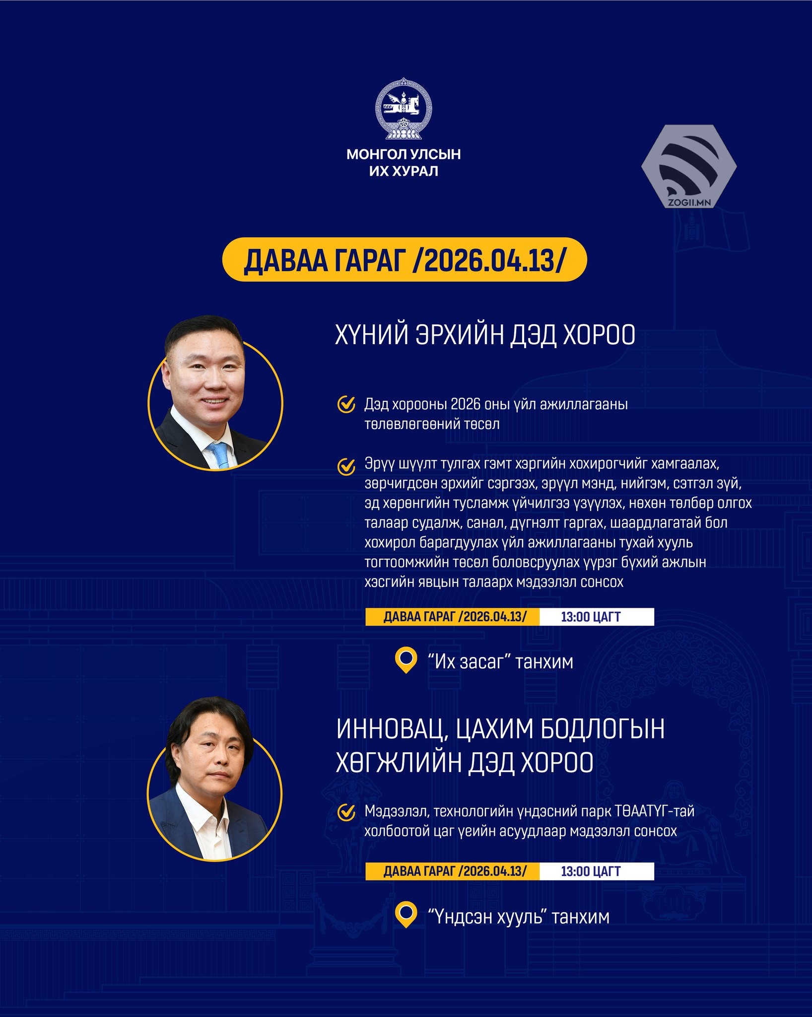 Өнөөдөр /2026.04.13/ Улсын Их Хурлын Дэд хороо, Ажлын хэсэг болон Улсын Их Хурал дахь намын бүлэг, зөвлөлийн хуралдаанаар хэлэлцэх асуудлуудыг танилцуулж байна.