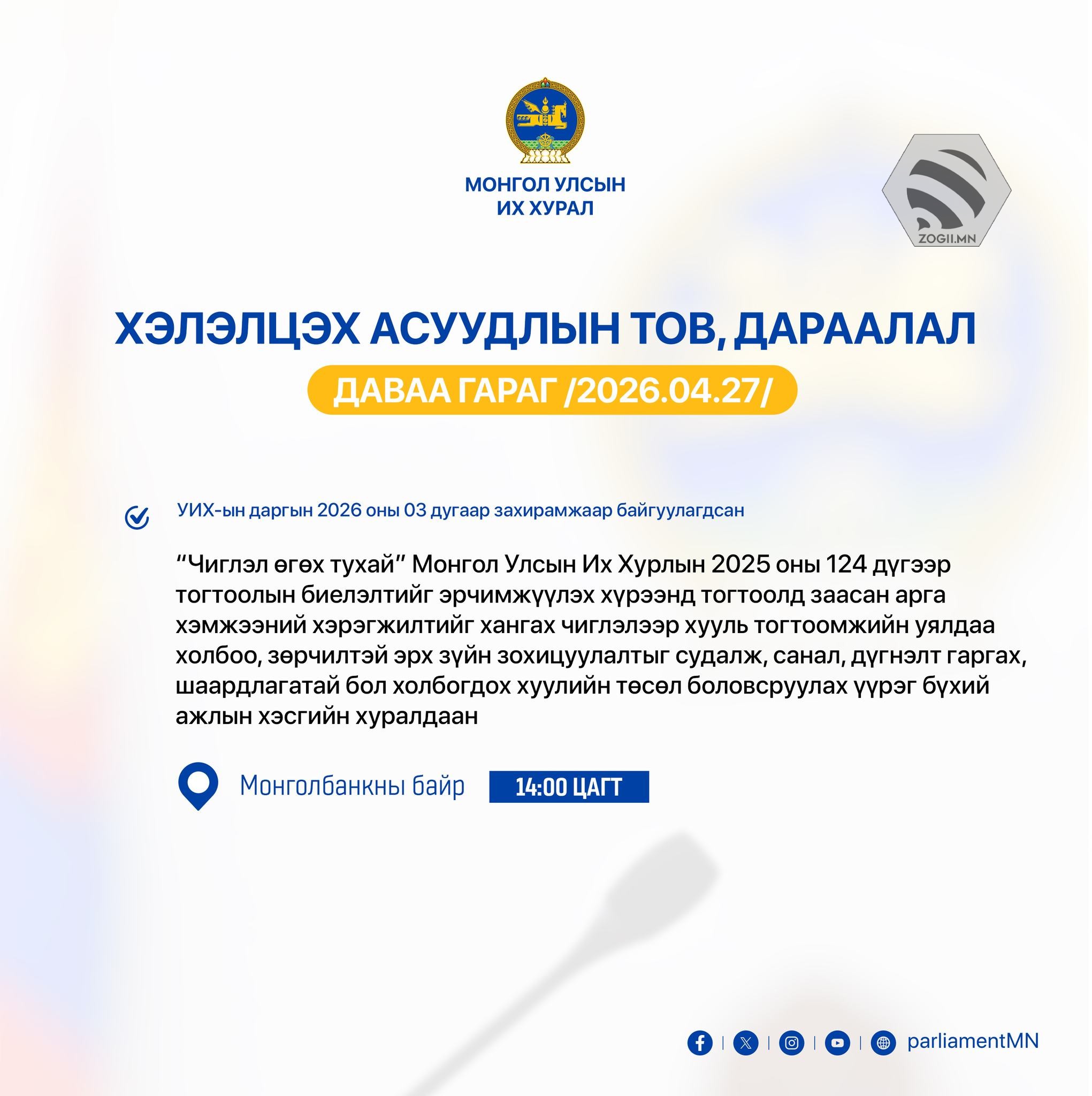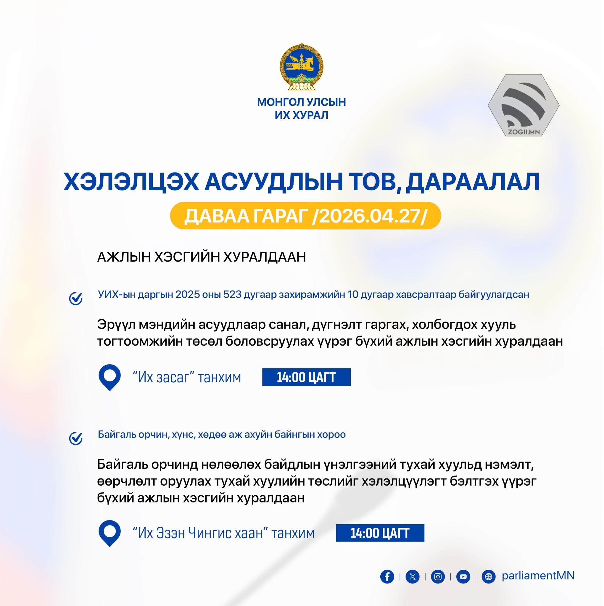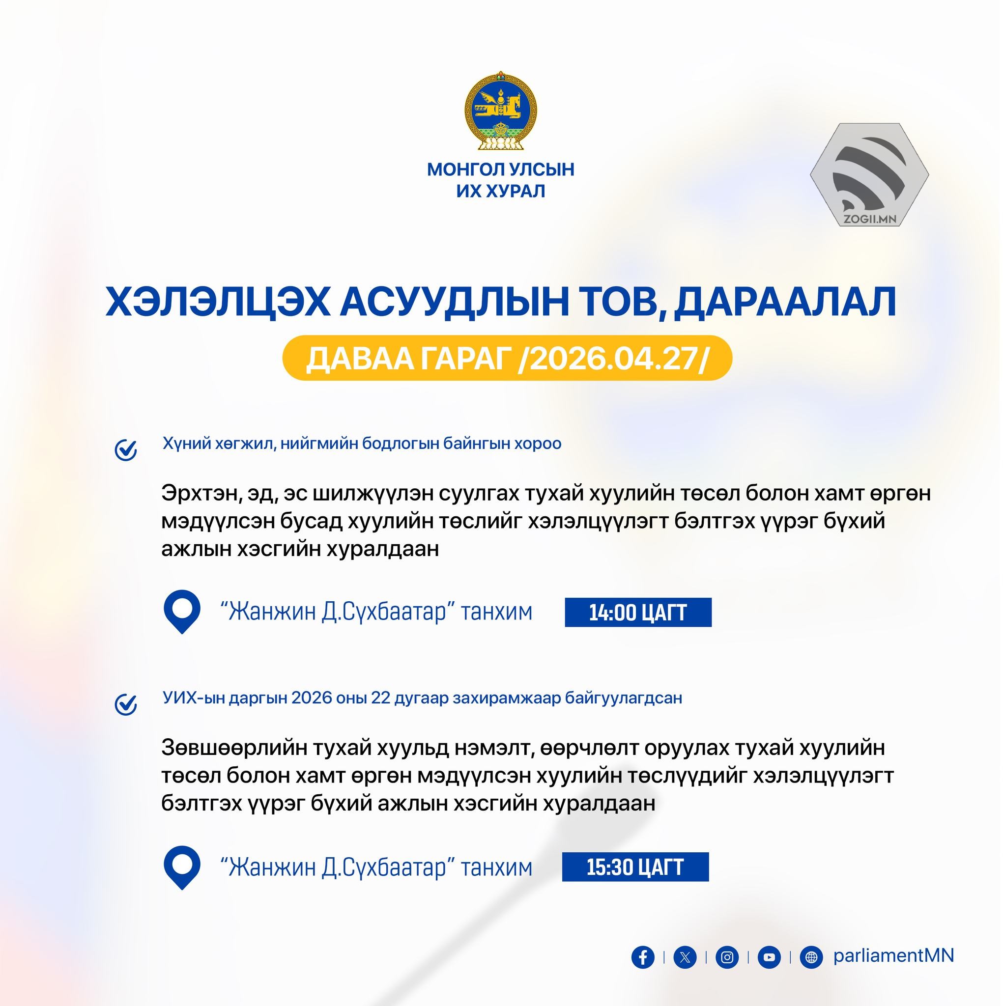 УИХ дахь намын бүлэг, зөвлөл болон УИХ-ын Дэд хороо, ажлын хэсгүүдийн өнөөдрийн (2026.04.27) хуралдаанаар хэлэлцэх асуудлуудыг танилцуулж байна.