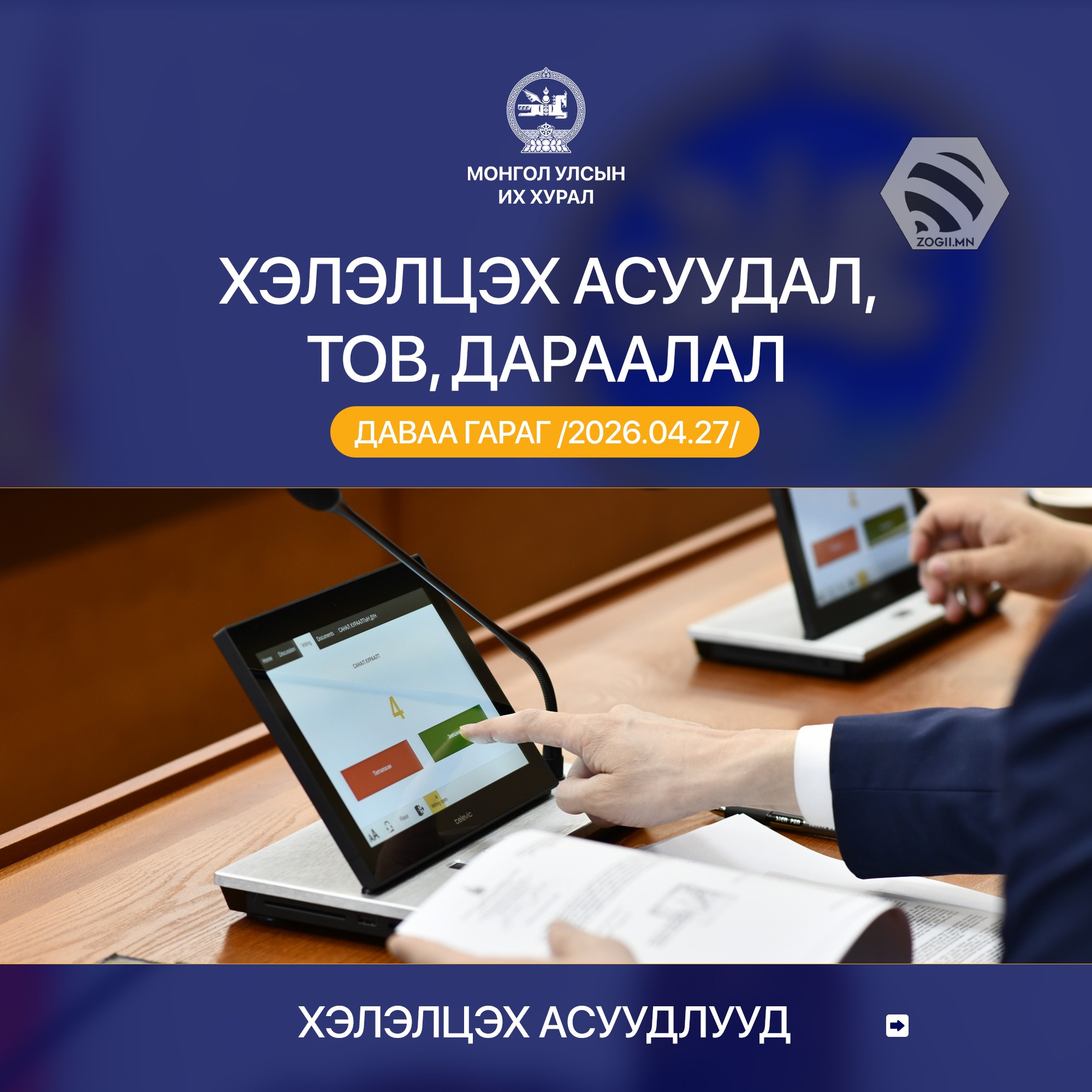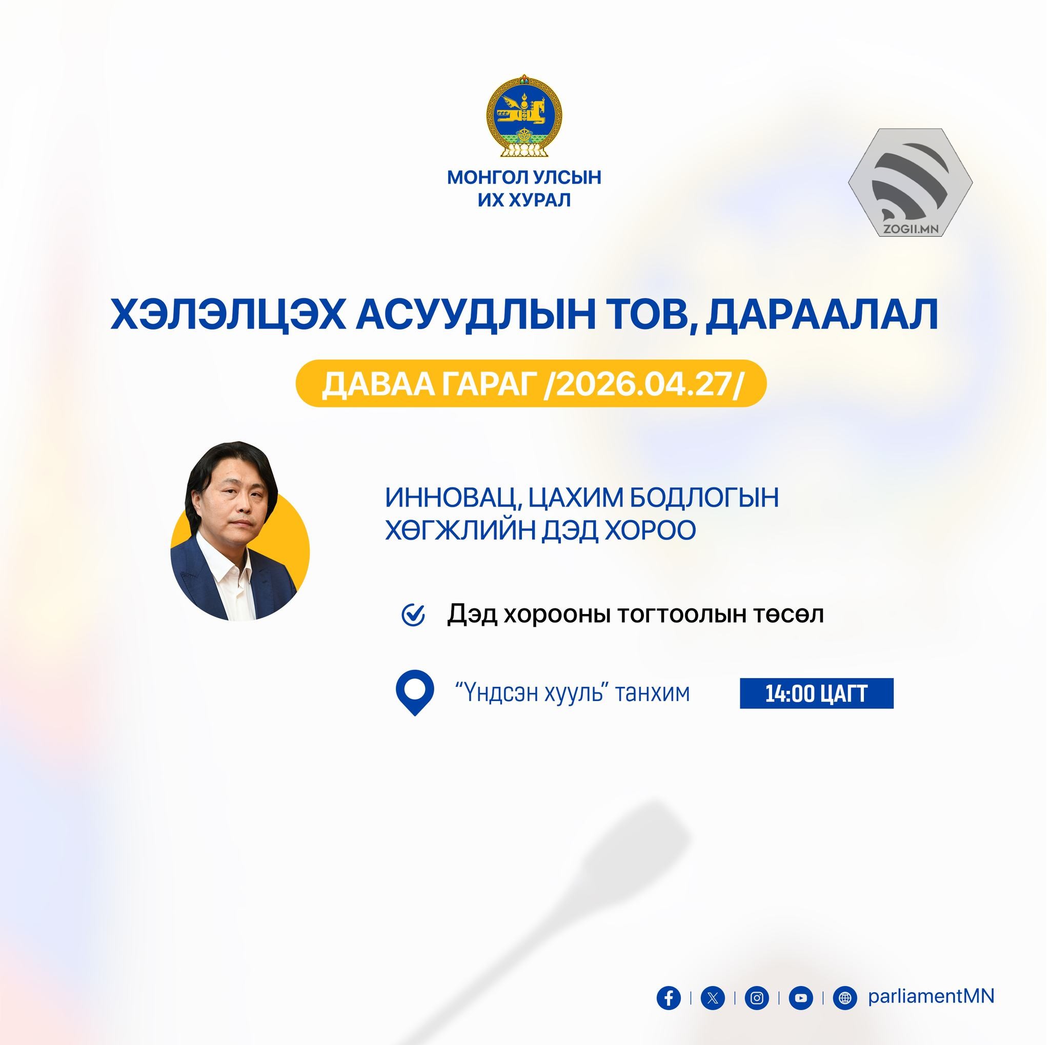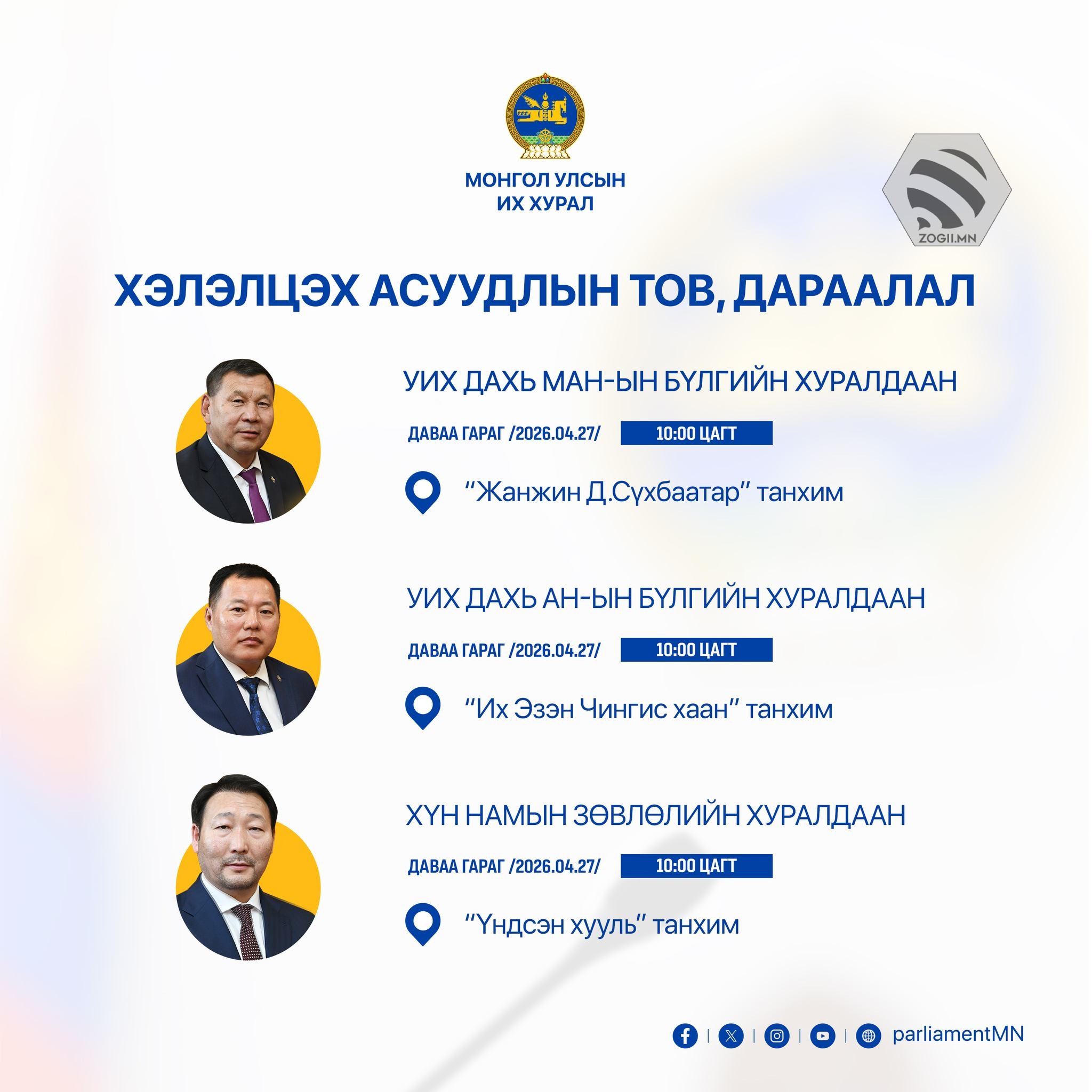 УИХ дахь намын бүлэг, зөвлөл болон УИХ-ын Дэд хороо, ажлын хэсгүүдийн өнөөдрийн (2026.04.27) хуралдаанаар хэлэлцэх асуудлуудыг танилцуулж байна.