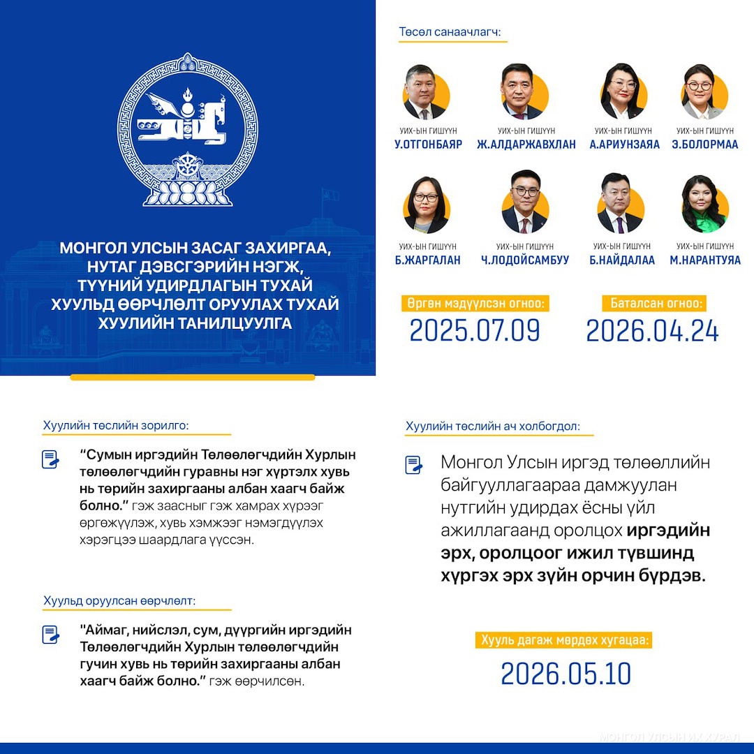 Монгол Улсын Их Хурлын 2026 оны хаврын ээлжит чуулганы 04 дүгээр сарын 24-ний өдрийн нэгдсэн хуралдаанаар Улсын Их Хурлын гишүүн У.Отгонбаяр нарын найман гишүүнээс 2025 оны 07 дугаар сарын 09-ний өдөр өргөн мэдүүлсэн Монгол Улсын засаг захиргаа, нутаг дэвсгэрийн нэгж, түүний удирдлагын тухай хуульд өөрчлөлт оруулах тухай хуулийн төслийг эцэслэн баталсан.